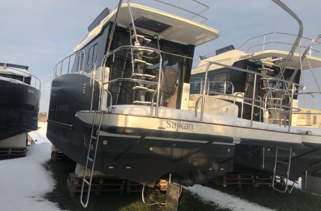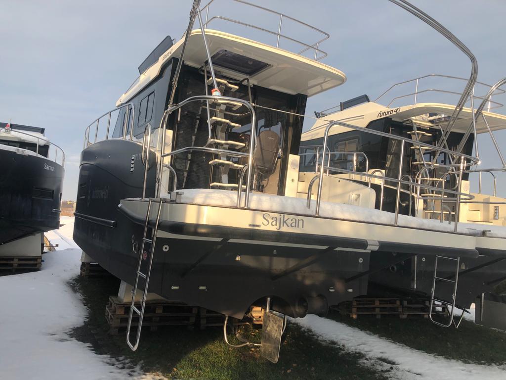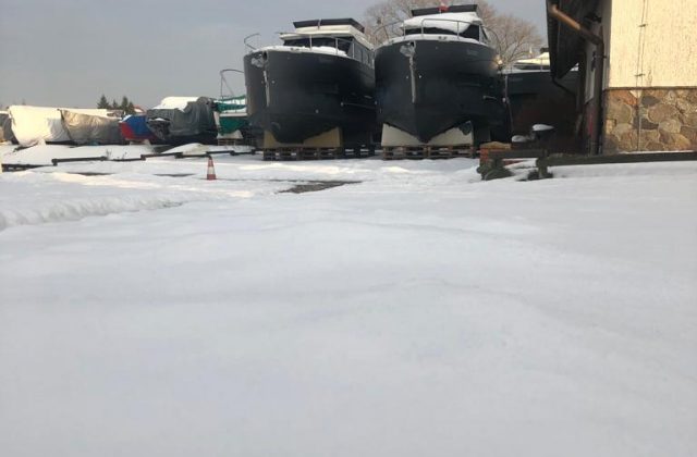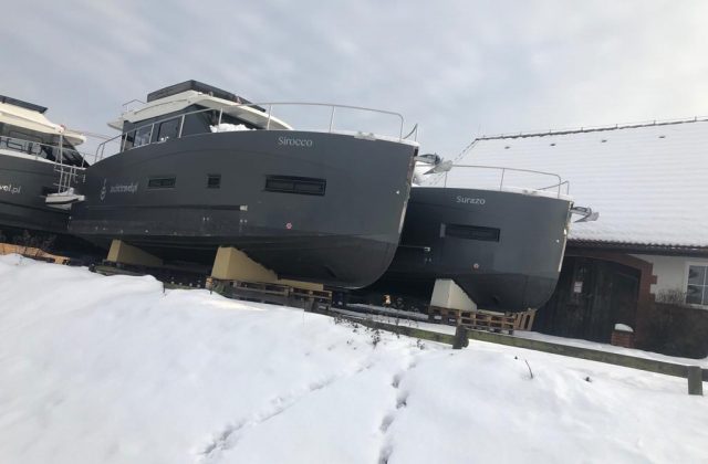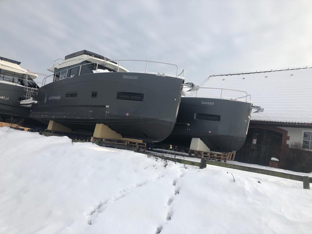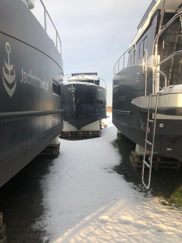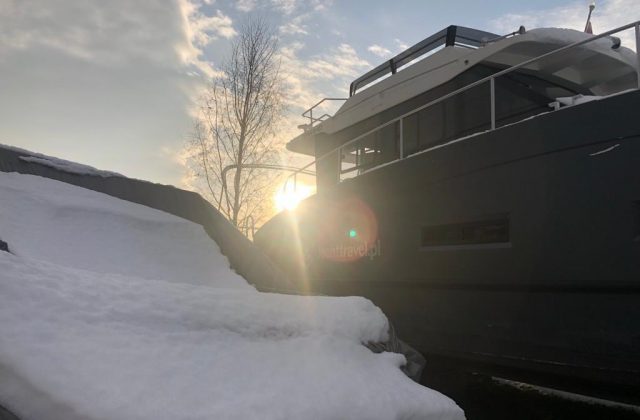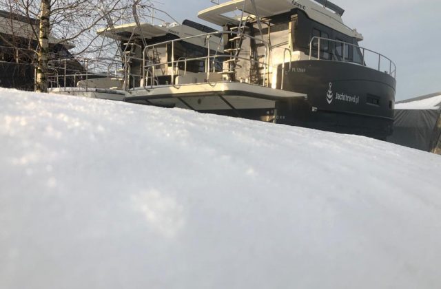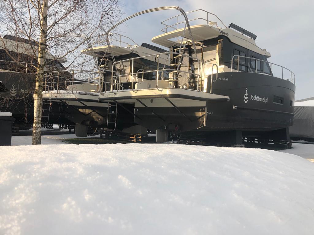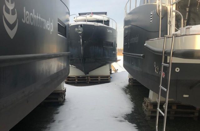 Po wyciągnięciu jachtu z wody trzeba dokładnie oczyścić dno z wodorostów i glonów, a kadłub pozostawić do wyschnięcia. Jacht wietrzymy i opróżniamy zbiorniki oraz przewody z wody i nieczystości. Przed mrozem zabezpieczamy przewody oraz układ napędowy płynami przeciw zamarzaniu. Pompy wody demontujemy na zimę i chowamy do ciepłego pomieszczenia. Po wyjęciu akumulatorów pamiętajcie, żeby utrzymywać przez całą zimę napięcie ok. 13V.